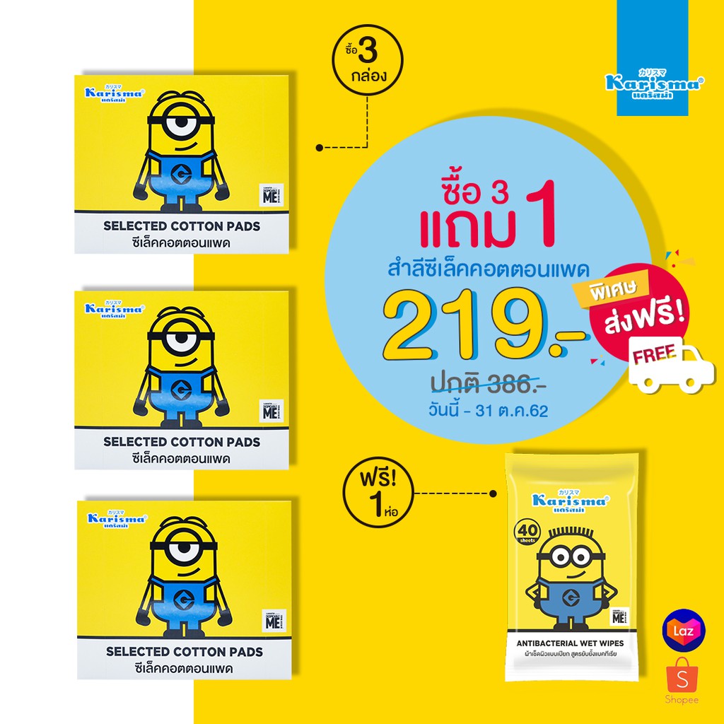 สั่งซื้อ [Official Store] แคริสม่า สำลีแผ่นซีเล็ค 90 แผ่น x 3 กล่อง แถมฟรี ผ้าเปียกมินเนียน 40 แผ่น 1 ห่อ ส่