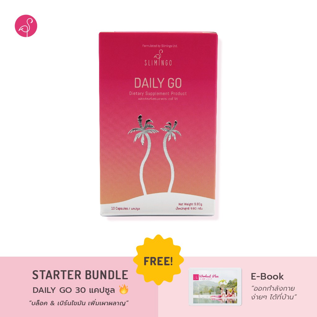 Slimingo Daily Go (สลิมอินโก เดลี่ โก้) ผลิตภัณฑ์เสริมอาหาร ที่ช่วยบล็อค&เบิร์นไขมัน พร้อมด้วยคุณสมบัติ 5B - Burn Block Break Build Bright ช่วยปรับสมดุลร่างกาย ช่วยเผาผลาญ จึงทำให้ร่างกายของคุณฟิต&เฟิร์มได้ไวขึ้น ให้น้ำหนักคุณค่อยๆลดลงพร้อมหุ่นที่กระชับได้สัดส่วน วิธีรับประทาน: ก่อนมื้อหนัก (กลางวัน หรือ เย็น) 30 นาที วันละ 1-2 เม็ด ขนาดบรรจุ: 10 แคปซูล