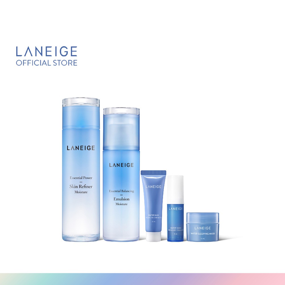 LANEIGE Essential Basic Moisture Set (2019 Holiday Collection) 1.Essential Power Skin Refiner_Moisture 200ml โทนเนอร์ที่ให้ความชุ่มชื้นแก่ผิวอย่างล้ำลึก สำหรับผิวแห้งโดยเฉพาะ วิธีใช้ ขั้นตอนที่ 1 ใช้โทนเนอร์ในตอนเช้า และก่อนนอน เทเนื้อผลิตภัณฑ์ออกพอประมาณ ลงบนสำลีให้ชุ่ม ขั้นตอนที่ 2 ใช้สำลีที่ชุบโทนเนอร์เช็ดตามทิศทางของผิว โดยเช็ดจากภายในของใบหน้า สู่ด้านนอก 2.Essential Balancing Emulsion_Moisture 120ml อิมัลชั่นชนิดให้ความชุ่มชื้นสำหรับผิวแห้ง เป็นขุย มีประสิทธิภาพในการฟื้นฟูสมดุลความชุ่มชื้นใต้ชั้นผิวอย่างล้ำลึก วิธีใช้ ขั้นตอนที่ 1 หลังจากขั้นตอนการใช้โทนเนอร์ในตอนเช้า และก่อนนอน กดเนื้อผลิตภัณฑ์ออกพอประมาณ ขั้นตอนที่ 2 ทาเนื้อผลิตภัณฑ์บนผิวหน้า โดยเกลี่ยจากด้านในของใบหน้า ออกสู่ภายนอก แล้วกดใช้ฝ่ามือกดเบาๆบนใบหน้าเพื่อให้เนื้อผลิตภัณฑ์ซึมเข้าสู่ผิวหน้าของคุณได้ดียิ่งขึ้น 3.Water Bank Moisture Cream EX 10ml ครีมบำรุงผิวที่ช่วยเติมพลังความชุ่มชื้นจากผิวคุณอย่างล้ำลึก ด้วยคุณค่าของน้ำแร่ Green Mineral water พร้อมปกป้องผิวคุณให้รู้สึกชุ่มชื้นยาวนานด้วยมอยส์เจอร์ฟิล์ม 4.Water Bank Moisture Essence EX 5ml เอสเซนส์เข้มข้น ที่อุดมด้วยส่วนประกอบจากน้ำแร่จากพืชพรรณธรรมชาติ Green Mineral water ที่ช่วยเติมเต็มความชุ่มชื้นแก่ผิวหน้า เผยผิวที่แข็งแรง ดูฉ่ำน้ำสุขภาพดี 5.Water Sleeping Mask 15ml Sleep-tox ™ ในมาส์กหน้าสำหรับเวลานอนช่วยให้ผิวดูมีชีวิตชีวาเช้าวันถัดไป ราวกับผิวได้พักผ่อนเป็นระยะเวลานาน **สินค้าภายในกล่อง** 1.Essential Power Skin Refiner Moisture 200ml 2.Essential Balancing Emulsion_Moisture 120ml 3.Water Bank Moisture Cream EX 10ml 4.Water Bank Moisture Essence EX 5ml 5.Water Sleeping Mask 15ml
