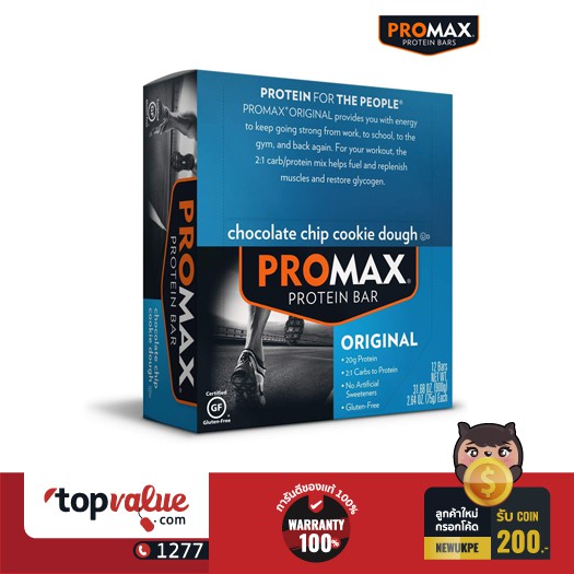 ▶▶โปรดอ่านก่อนสั่งซื้อ◀◀ ✔️สินค้าทุกชิ้นของทางร้าน Topvalue เป็นสินค้าใหม่ ของแท้ 100% สามารถออกใบกำกับภาษีเต็มรูปแบบได้ ✔️บริษัทฯ ยินดีรับเปลี่ยน / คืนสินค้า ภายใน 7 วัน ♻️ สาเหตุและข้อตกลงของการขอเปลี่ยนหรือคืนสินค้า ♻️ 1.สินค้าใช้งานแล้วมีปัญหาภายใน 7 วัน : บริษัทจะเปลี่ยนสินค้าใหม่ให้ลูกค้า 2.เปลี่ยนใจ : ไม่สามารถขอคืนสินค้าได้ แต่สามารถเปลี่ยนสีหรือรุ่นที่ราคาเท่าเดิม 3.ได้รับสินค้าผิด : สินค้ายังไม่ถูกใช้งาน และต้องอยู่ในสภาพสมบูรณ์ 4.สินค้าไม่ตรงตามที่โฆษณาไว้ : สินค้าไม่สามารถใช้งานได้ตามที่บรรยายไว้ สินค้ายังไม่ถูกใช้งาน และต้องอยู่ในสภาพสมบูรณ์ 5.สินค้าชำรุด/เสียหาย : ส่งสินค้ากลับมาให้ทางบริษัทตรวจสอบ กล่องและอุปกรณ์ต้องครบ - หากพบว่า มีปัญหาจริง บริษัทจะเปลี่ยน/คืนเงินให้ - หากพบว่า ไม่ได้มีปัญหาจริง บริษัทจะจัดส่งสินค้าเดิมให้ ✔️ทางบริษัทฯ จะรับผิดชอบค่าขนส่ง จากข้อผิดพลาดของทางบริษัทฯ เขตกรุงเทพฯ ไม่เกิน 150 บาท และ ต่างจังหวัด ไม่เกิน 300 บาท ☎️ สอบถามรายละเอียดสินค้าได้ทาง Chat หรือติดต่อ Topvalue Call center 1277 ✄============================== แนะนำสินค้า Promax Protein Bar Original Chocolate Chip Cookie Dough (กล่องx12ซอง) Promax Bar ประกอบด้วยโปรตีนคุณภาพสูง 20 กรัม มีวิตามินและแร่ธาตุกว่า 18 ชนิด รสชาติที่อร่อย ไม่ใส่สารให้ความหวาน, สารกันบูด, fructose corn syrup ต่ำ, ไม่มีไขมันทรานส์, maltitol หรือ gelatin ในโปรตีนบาร์ Gluten-free และ มังสวิรัสสามารถรับประทานได้The Promax Original Chocolate Chip Cookie Dough มีสัดส่วนคาร์โบไฮเดรตต่อโปรตีน 2 ต่อ 1 ซึ่งเป็นสัดส่วนที่พอเหมาะสำหรับคนที่มีไลฟ์สไตล์แอคทีฟ โดยโปรตีนและคาร์โบไฮเดรตจะไปช่วยปกป้องการสูญเสียกล้ามเนื้อ และเป็นพลังงานสำหรับคุณก่อนออกกำลังกาย รวมถึงไปเสริมตัว Glycogen และโปรตีนจะช่วยซ่อมแซมกล้ามเนื้อหลังออกกำลังกาย บาร์นี้เหมาะสำหรับรับประทานก่อนและหลังออกกำลังกาย ทดแทนอาหาร และของว่างที่พกพาสะดวก คุณสมบัติ โปรตีน 20 กรัม สำหรับเสริมสร้างกล้ามเนื้อ ไม่มีการใส่สารให้ความหวาน และสารกันบูด ประกอบด้วยวิตามิน และแร่ธาตุกว่า 18 ชนิด และสารต่อต้านอนุมูลอิสระ Certified kosher Gluten free