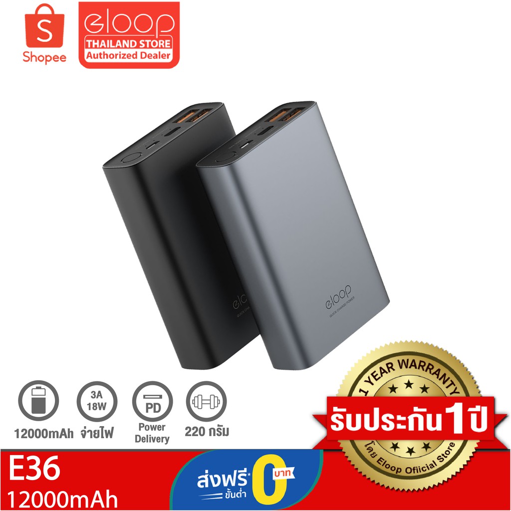 สั่งซื้อ [ส่งฟรี 0.-] Eloop E36 แบตสำรอง 12000mAh รองรับชาร์จเร็ว Fast Quick Charge QC 3.0/2.0 + PD ของแท้ ปร