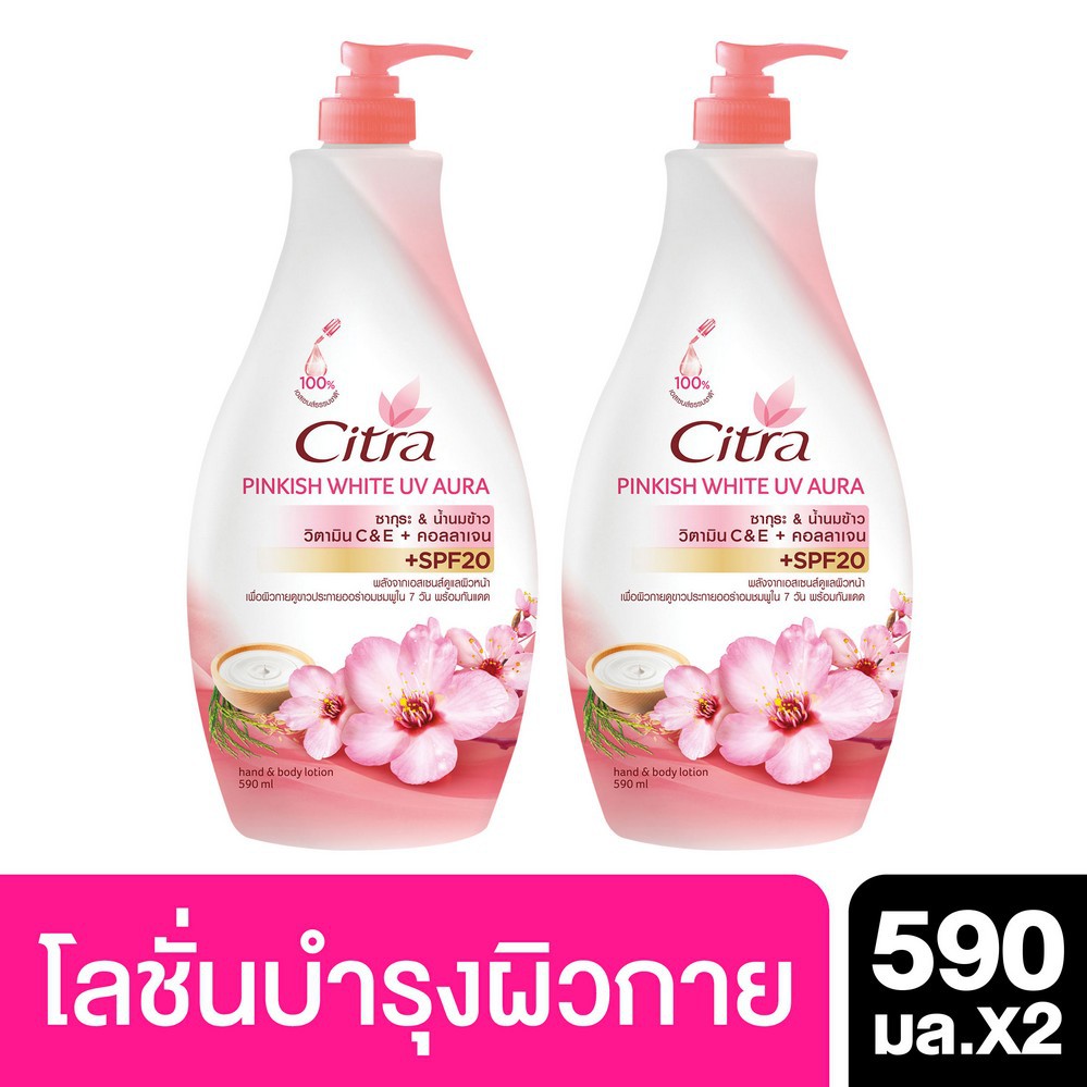 Citra Pinkish Whitening UV Aura Lotion 590 ml ซิตร้า พิงค์กิชไวท์ 590 มล. (2 ขวด) ซิตร้า พิงค์กิชไวท์ 590 มล พร้อมซากุระเอสเซนส์จากญี่ปุ่น SPF20 PA++ และ วิตามิน C และ E เพื่อผิวเนียนละเอียด ดูขาวอมชมพูในแบบคุณ โลชั่นบำรุงผิวจากธรรมชาติที่ผสานคุณค่าจากสารแอนตี้ออกซิแดนท์ และพลังจากวิตามินต่างๆ พร้อมปกป้องคอลลาเจนเพื่อเผยสัมผัสผิวที่เนียน ดูขาวเปล่งประกาย ไม่ต้องกลัวแดด